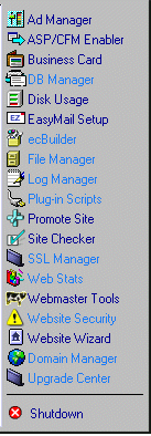 The Webmaster Tools feature is made available by our good friends at Tucows Interactive. It gives you access to a variety of useful software, developed to enrich your web presence. These tools are available at the click of a mouse, and they let you take advantage of web developing software such as color pickers, style sheets, editors, image mappers, and image animators.